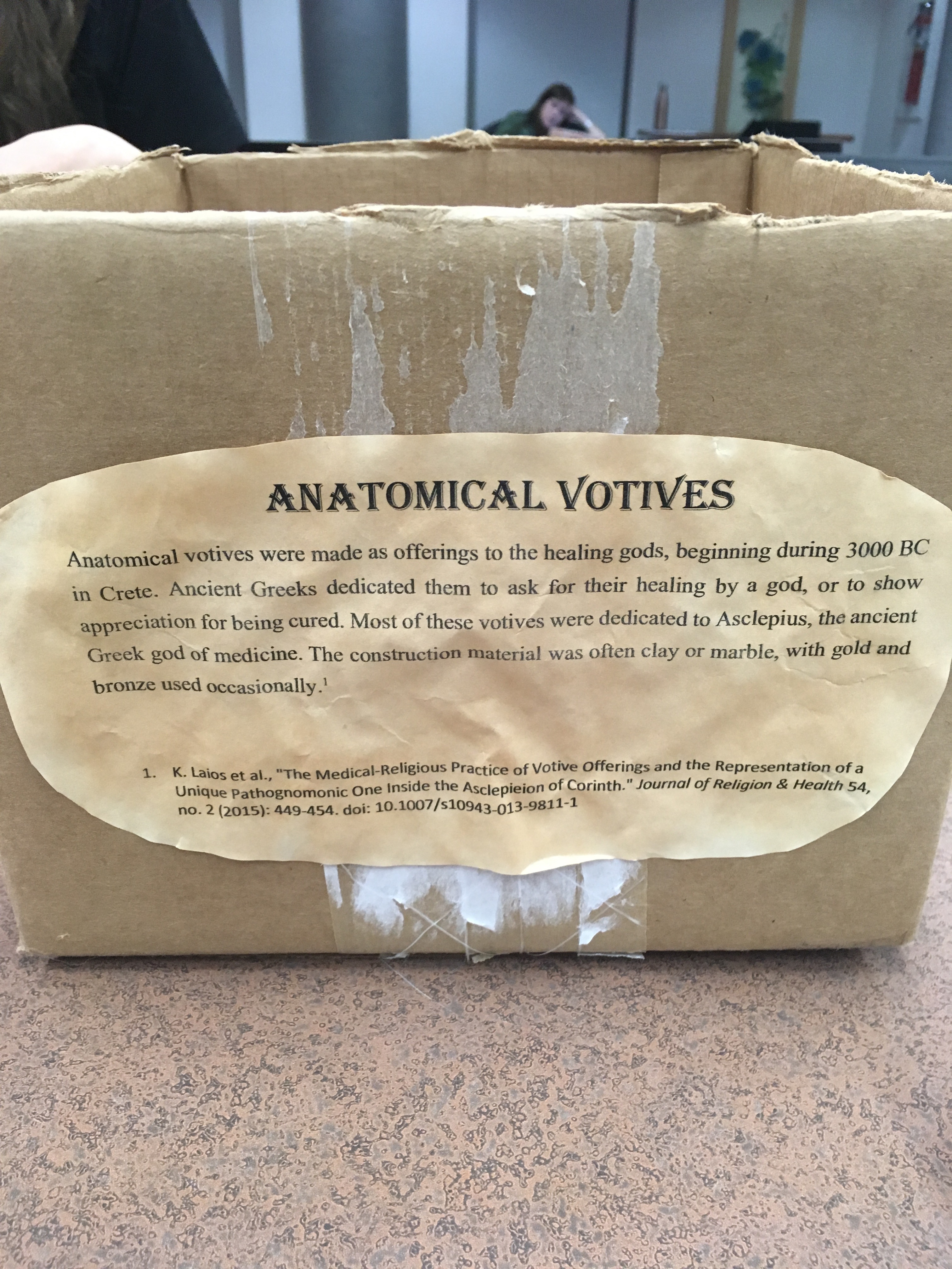 Pre-med student Emily Sechrist ’21 studied Hellenistic, Early Roman, and Second Temple healing practices and developed diagnostic reports of ailments found in the gospels. As part of this project, she created anatomical votives.