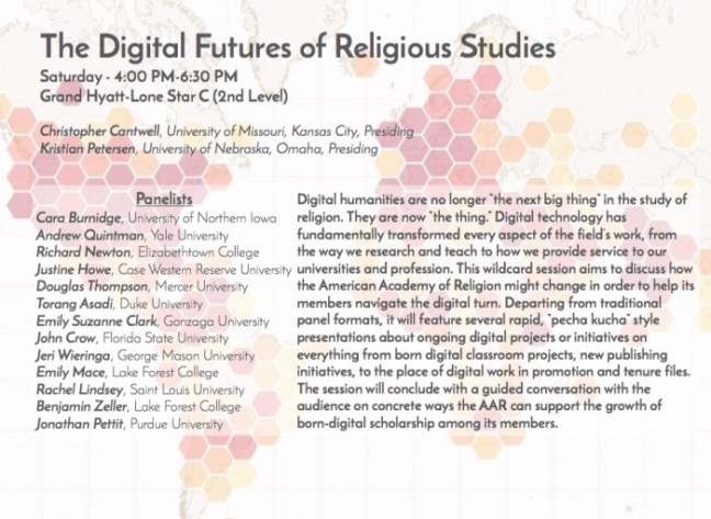 I’ll be discussing Sowing the Seed as an emerging model of scholarly communication. Highlights will include how our student-scholar collaborative model works, our growing influence in the “small internet,” and how our team members are raising the discourse inside and outside of the academy. This high-paced, “pecha kucha” style session features some of the most innovative digital projects in the guild. I’m honored, humbled, and honestly a bit nervous to join such esteemed colleagues in this event that you won’t want to miss. The session will sport its own hashtag: #DigitalReligion