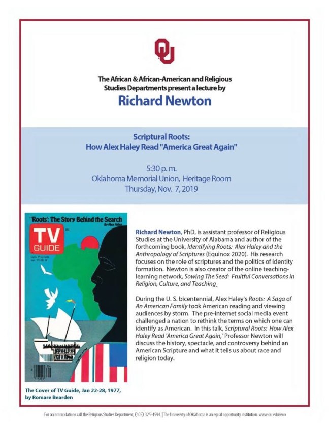 And if you’re in the neighborhood on Thursday evening, come check out my public lecture, “Scriptural Roots: How Alex Haley Read ‘America Great Again.'” We’ll take a trip down the nation’s memory lane to better learn how race and cultural texts have worked not only in the Post-Civil Rights Era, but also in the era of “Fake News.”